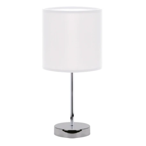 Jednoduchá, ale elegantná biela stolná lampa s chrómovou nohou.